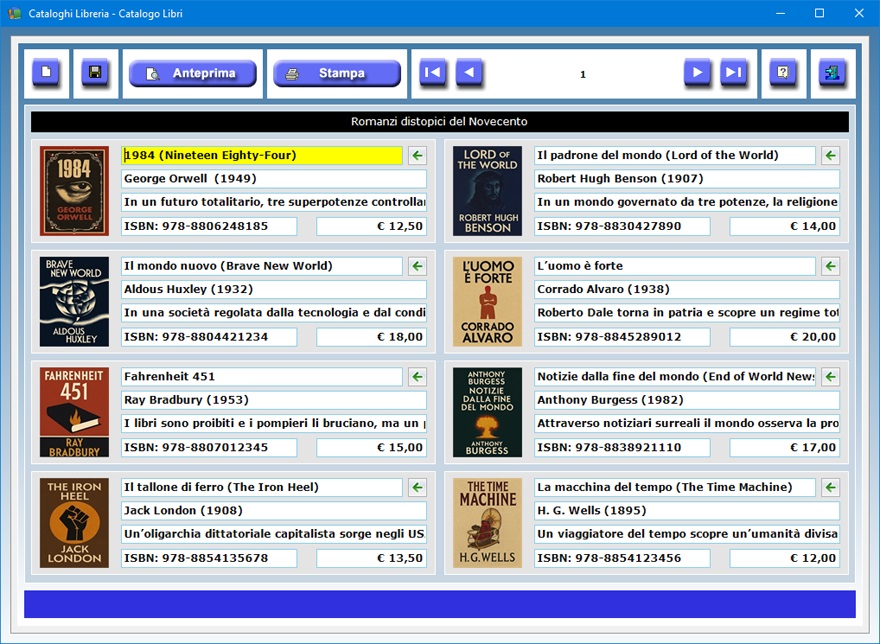 ciascuna contenente i dati di otto libri con foto in
