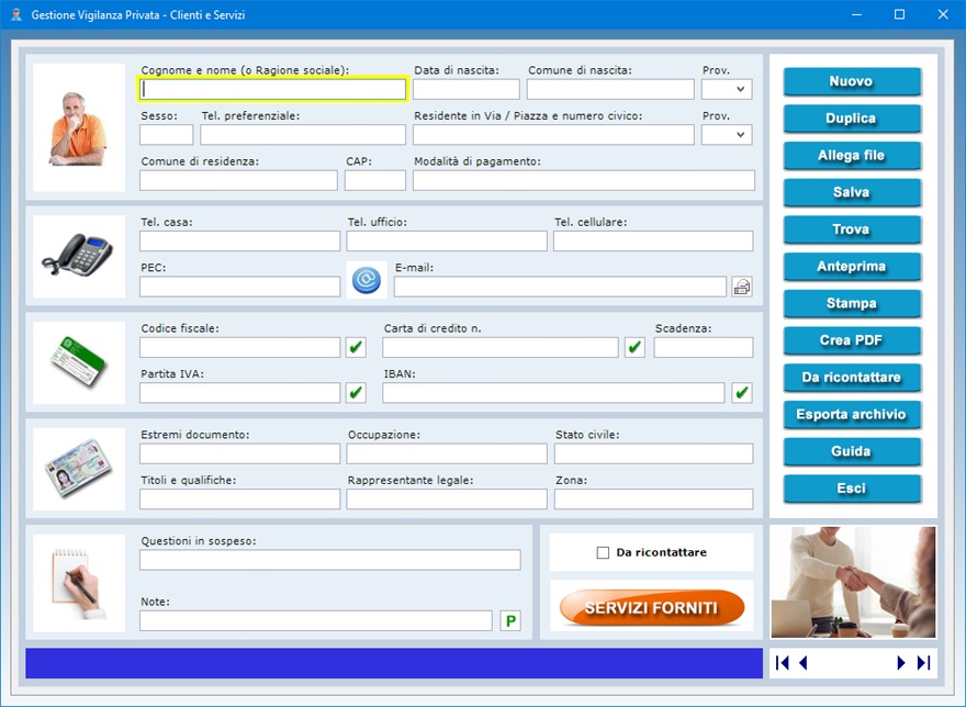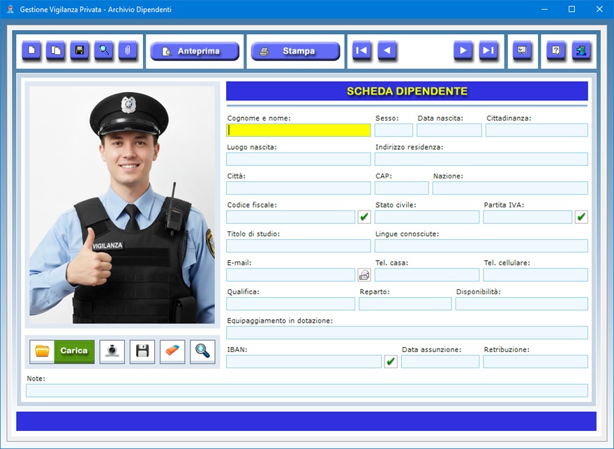 l'equipaggiamento in dotazione, l'IBAN bancario, la